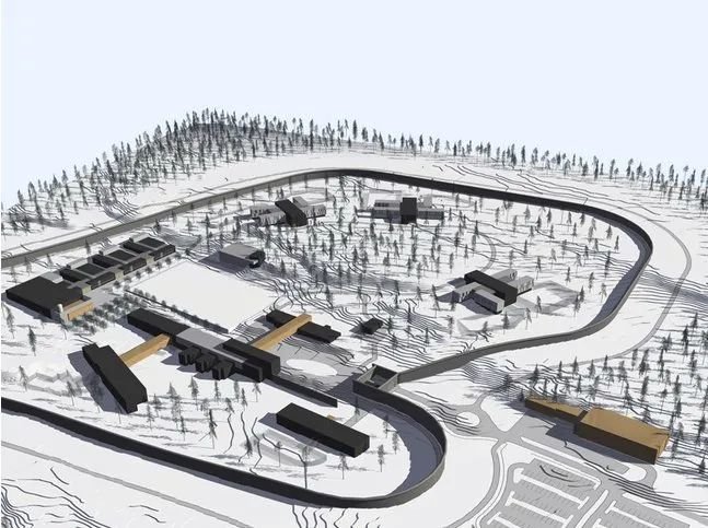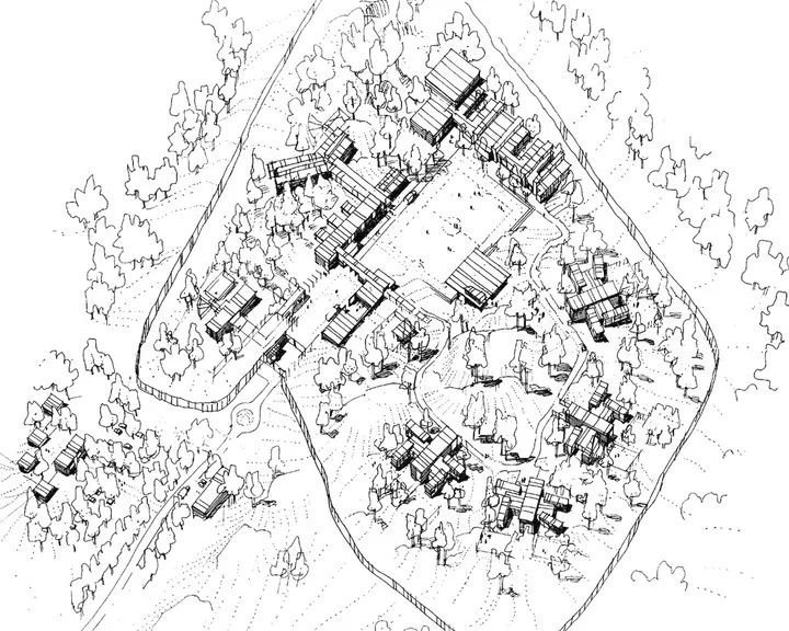 建筑通过其 "屋顶的折叠平面”结合在一起。这些屋顶改变了建筑的规模和形式,但规则折叠的统一运用,为设施内47座建筑提供了一致性;不同功能的空间包括里门厅、健身房、车间、医疗中心和宿舍。
