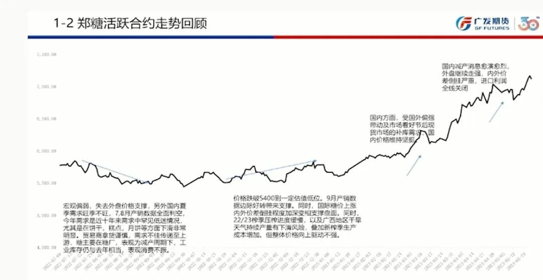 国内郑糖上涨的幅度也相对比较大,从今年年初接近不到6000元的价格,目前有接近1000点的涨幅。其实外盘的走强也为国内价格上涨形成了比较强劲的动力。因为国内除了国产糖另外还有很大一部分需要国外进口。如果外盘价格比较高,我们进口的成本也是水涨船高。从外盘越过20美分每磅以后,我们的进口利润基本上已经全线关闭。所以,下半年来看,我们进口到港量也是急剧下滑。另外,国内今年产量减产也比较严重。因为去年7月份之后,广西主产地天气相对比较炎热,所以甘蔗的生长也受到一定的影响,比如株高也是近10年来比较低的水平,甘蔗空心现象也比较严重。国内有接近90万吨产量的下滑,所以供给端收缩比较严重。另外因为我们去年四季度疫情放开,市场也比较看好今年的需求市场。消费也呈现出一定的复苏,虽然可能消费并没有非常好,但是因为我们供应端收缩太严重,所以价格也比较强势。目前来看,价格也是2016年以来6年的新高。