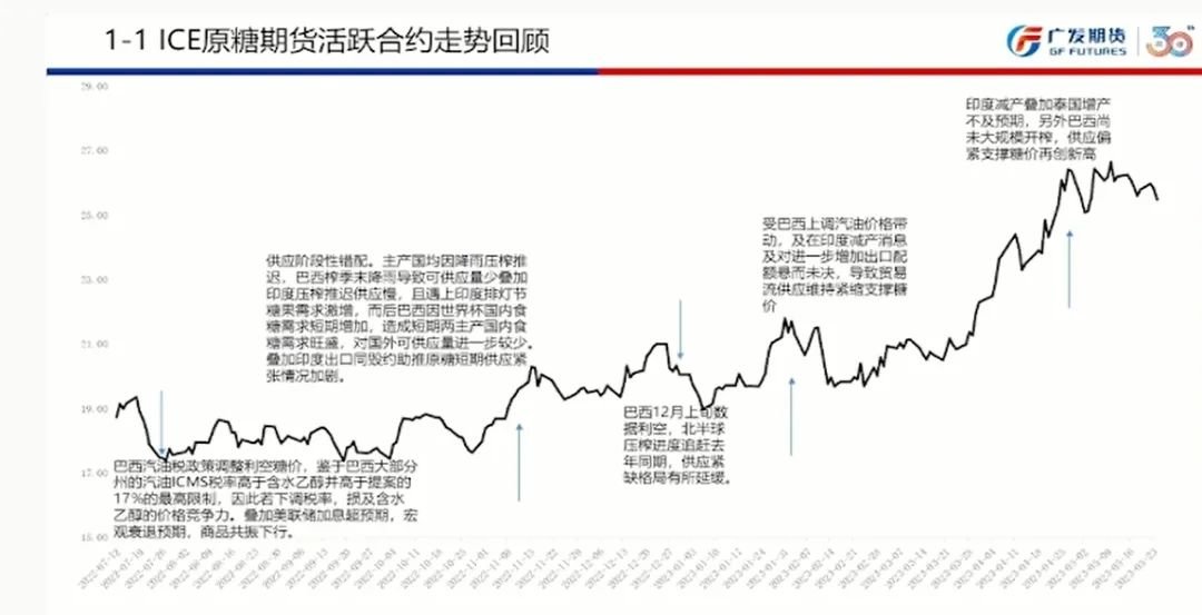 最近白糖期货和现货共同大涨越过了7000元的大关,之后上涨空间还有多少?或是面临了接近6年的高位,它的转折点什么时候可以来临?回顾行情,ICE原糖之前呈现出一波比较强势的上涨,但近期在24和25美分每磅之间进行高位盘整,后面是否会有继续新高可能?之前这波上涨到底有什么样的故事发生?其实这波上涨可以追溯到去年11月份,也是因为阶段性的供需错配。去年四季度主产国的降雨因为受“三重”拉尼娜的影响,东南亚地区印度、泰国还有巴西降雨量增加。降雨导致印度、泰国的压榨供应迟缓,另外降雨也使得印度、泰国甘蔗的产量受损。泰国甘蔗因为雨水太多使得甘蔗高度比较有限。泰国的产量不及预期,印度的减产也比较大。另外巴西四季度末进入了一个榨季尾声,新榨季没有大规模开榨,所以供给的收敛程度比较大。同时四季度需求相对比较旺盛,比如印度的排灯节包括巴西的世界杯。供需的矛盾一直都没有得到很好的解决,所以价格也从之前的19美分一路上涨到目前24、25美分每磅的高位。