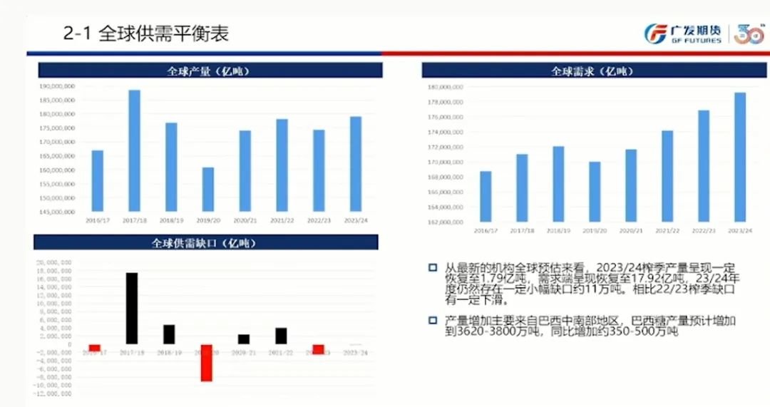 关于供需缺口,2022、2023榨季基本上已经结束,因为随着巴西3月底的收榨,北半球也在4、5月份基本上收榨。所以我们2023榨季已经结束,我们可以看到产量有一定下滑。去年10月份的时候,我们其实对于2022、2023榨季的预估还是增产的。但是因为“三重”拉尼娜的影响,印度、泰国的产量不及预期,所以这也是点燃糖价上涨的一个因素。