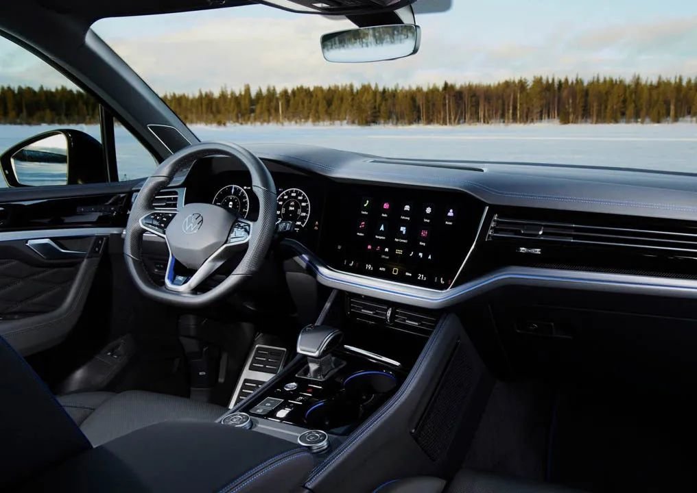 因为是中期改款,全新途锐内饰基本没有变化,包括车内嵌入式中控屏尺寸也没有明显提升,搭配旧款已经采用全液晶仪表的造型,方向盘继续延续三辐式造型,并且配备电子换挡机构。