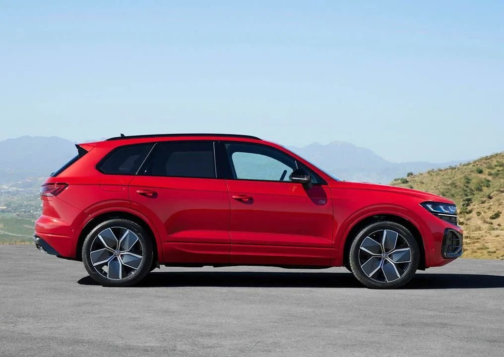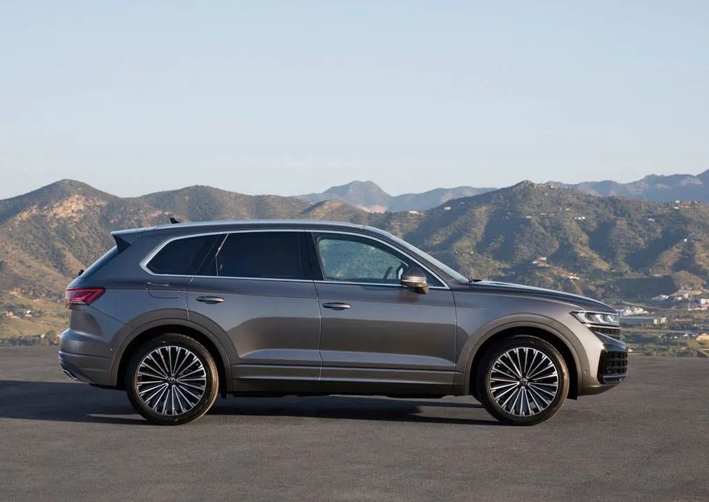 车身侧面,全新途锐依旧延续旧款平直而规整的设计,也因造型与大众途观差别不大而降低了新车高级感,不过新款将换上全新样式的轮毂造型,其中R-Ling版设计更显运动。