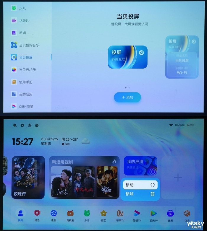 当贝OS还具有魔法同屏功能,手机、投影设备可快速同步,手机可反向操控大屏。