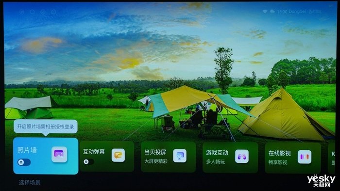 露营模式针对近年流行的户外露营场景而设,提供了照片墙、互动弹幕、投屏、游戏互动、影视、K歌、壁纸等功能。三五好友可边享受户外美景,边玩趣味游戏。
