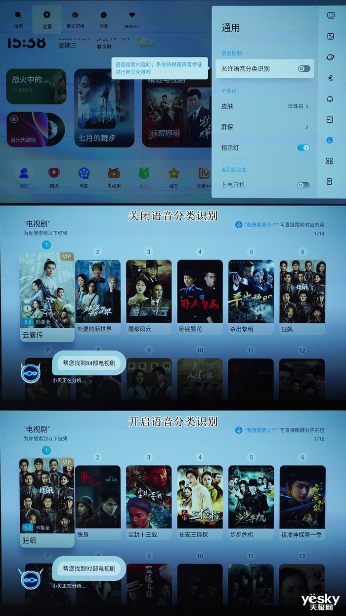 操控方面,当贝F6通过遥控器上的语音键可实现近场语音操控。系统还提供了语音分类识别功能,可根据性别、年龄层等人群的声线特征,呈现区别化且符合用户特质的内容。我们测试了一下,开关功能下,以男性声音探索“电视剧”,确实呈现出了不同结果,开启的情况下会更有针对性。另外,当贝OS支持全网搜片,可一键搜索直达想要观看的影片界面,节省在多平台内重复搜索的繁琐步骤。
