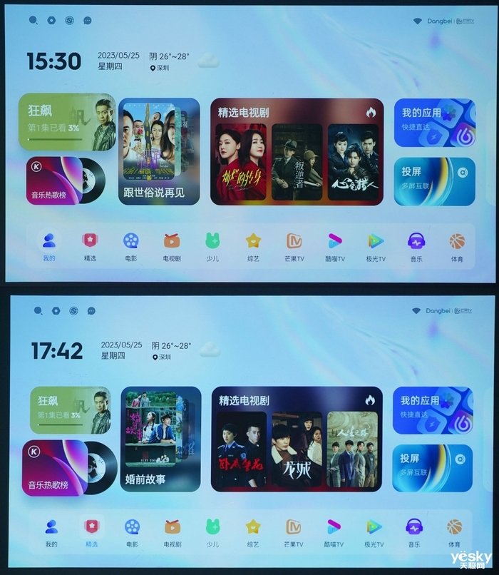 当贝OS 4.0系统相比以往采用了新的交互UI设计,比如灵动小组件(据介绍这是投影行业首次采用组件),用户能够直接将小组件放到桌面,实现快键进入,比传统瀑布流UI方便,并且非常自由。