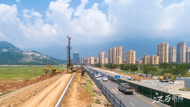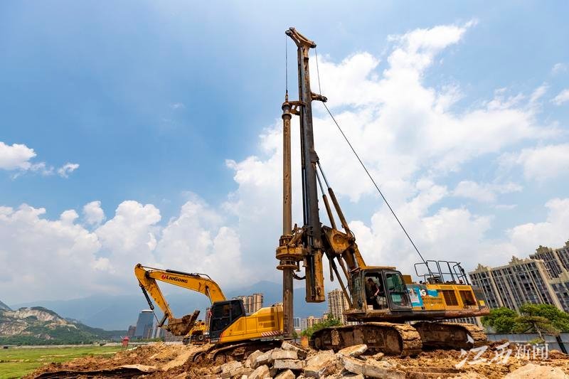5月29日,庐山市南康堤上,机械轰鸣,工人们正在进行桩基施工。庐山市对城市防洪工程进行全面提质升级整治,在完善水利设施,保护人民群众生命财产安全的同时,将城市防洪工程打造成水利风景亮点。特约通讯员 韩俊烜摄