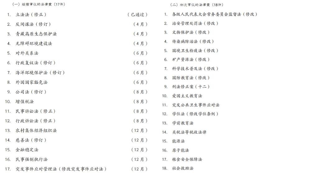 在预备审议的项目中,立法工作计划列入了修改城市居民委员会组织法、保守国家秘密法、反不正当竞争法等,以及制定耕地保护法、不动产登记法、网络犯罪防治法等。