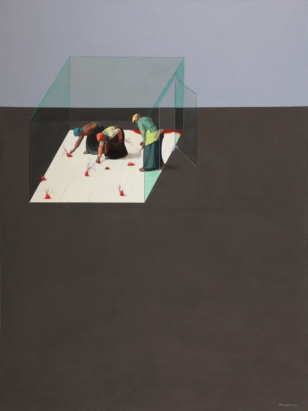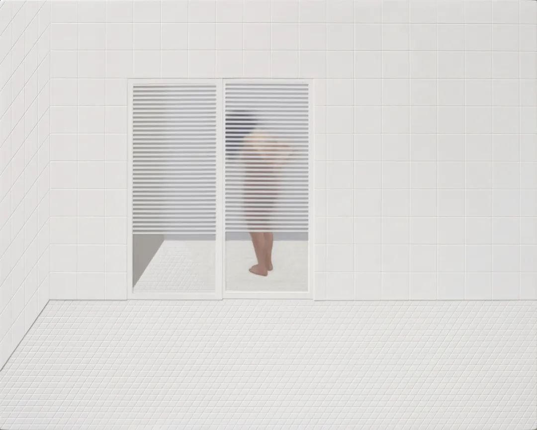 在他创作的第二阶段中(2014-2016),我们不难看到,平行透视依然延续,但夸张的残酷剧场被减弱,叙事性也逐渐淡出。与之相反作为建筑元素的网格则被更明显的放大,和空间中的肉身形成反差。比如在创作于2014年的《洗背图》中,由白色网格瓷砖组成的浴室空间将淋浴的肉体包裹在白色条格的玻璃之中。一位裸体的女性正在洗浴,地上是乳白色的水迹,区别于偏冷的白色瓷砖。