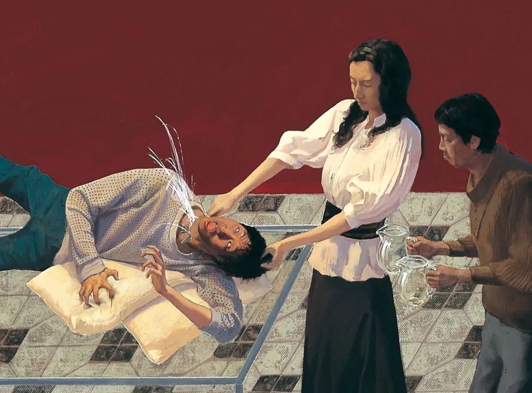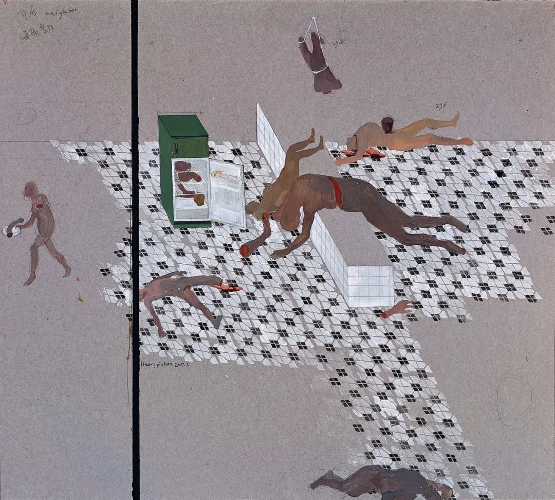 除此之外,黄一山这一时期作品中的批判性表现在其场景中所描绘的诡异或残酷事件。和同时代带有批判色彩的中国艺术实践一样,在21世纪中国经济急速发展的第一个十年中,荒诞不经的社会新闻往往是艺术家们创作的灵感来源。它们仿佛就是在高速现代化推进下无所适从的“疯癫”(福柯)。