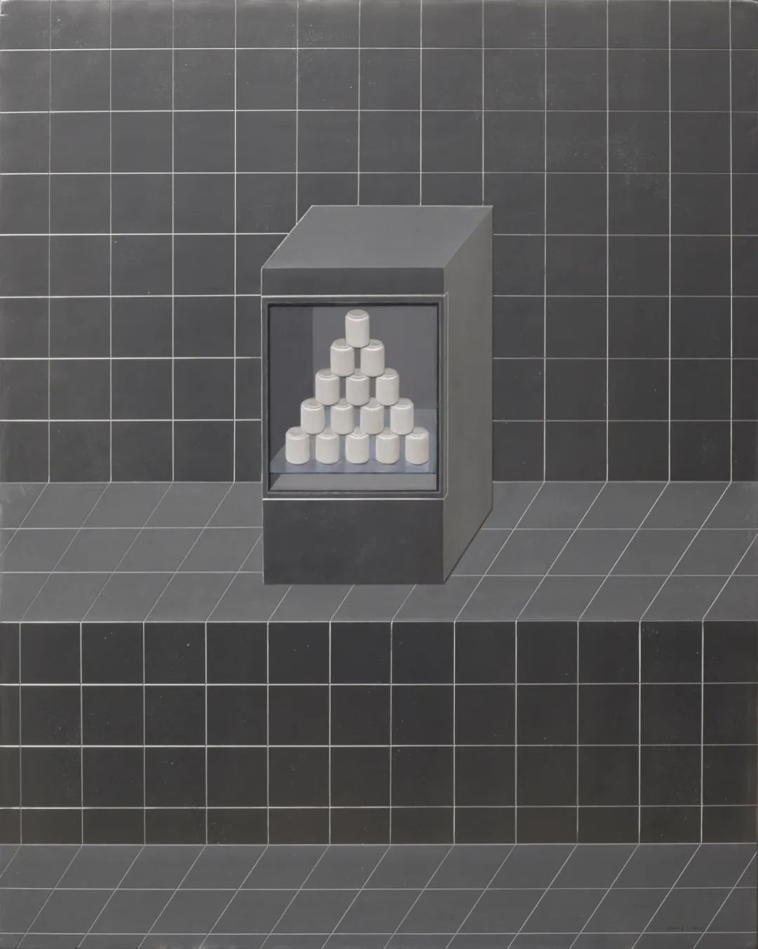 在另一张同样创作于2014年的作品《杯塔》中,这种网格的极简主义被放大到极致,甚至去掉了人的形象。批量生产的几何工业化方形瓷砖创造了一个灰色的平行透视空间,在其中同样是批量生产,但堆成三角形的白色杯子被置于一个灰色的消毒柜中。