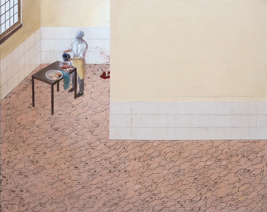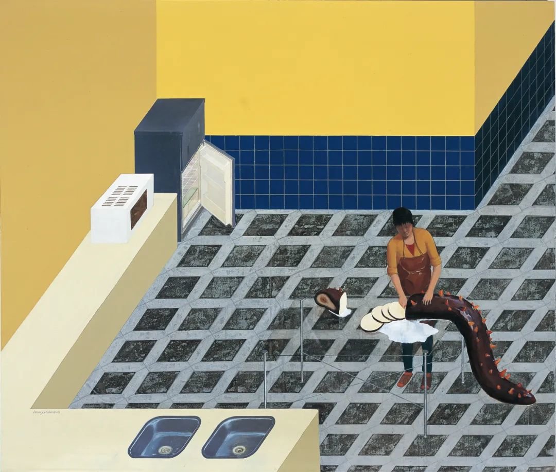 黄一山画于2009年的作品《牛奶系列之厨房》将场景设在一个平行透视空间的宽敞厨房。黄色墙体,在沿墙摆放的长条柜上有一台白色的微波炉,紧贴边上的是一个半开门的冰箱,而地板是同质化的方格。一位身着土黄衣衫的厨师正在透明的玻璃桌上切一条巨大的海参状生物,其中流出白色的汁液。黄一山这一时期的作品都有着类似的特征:在平行透视和网格化的室内环境中呈现极具戏剧化的诡异或残酷事件。