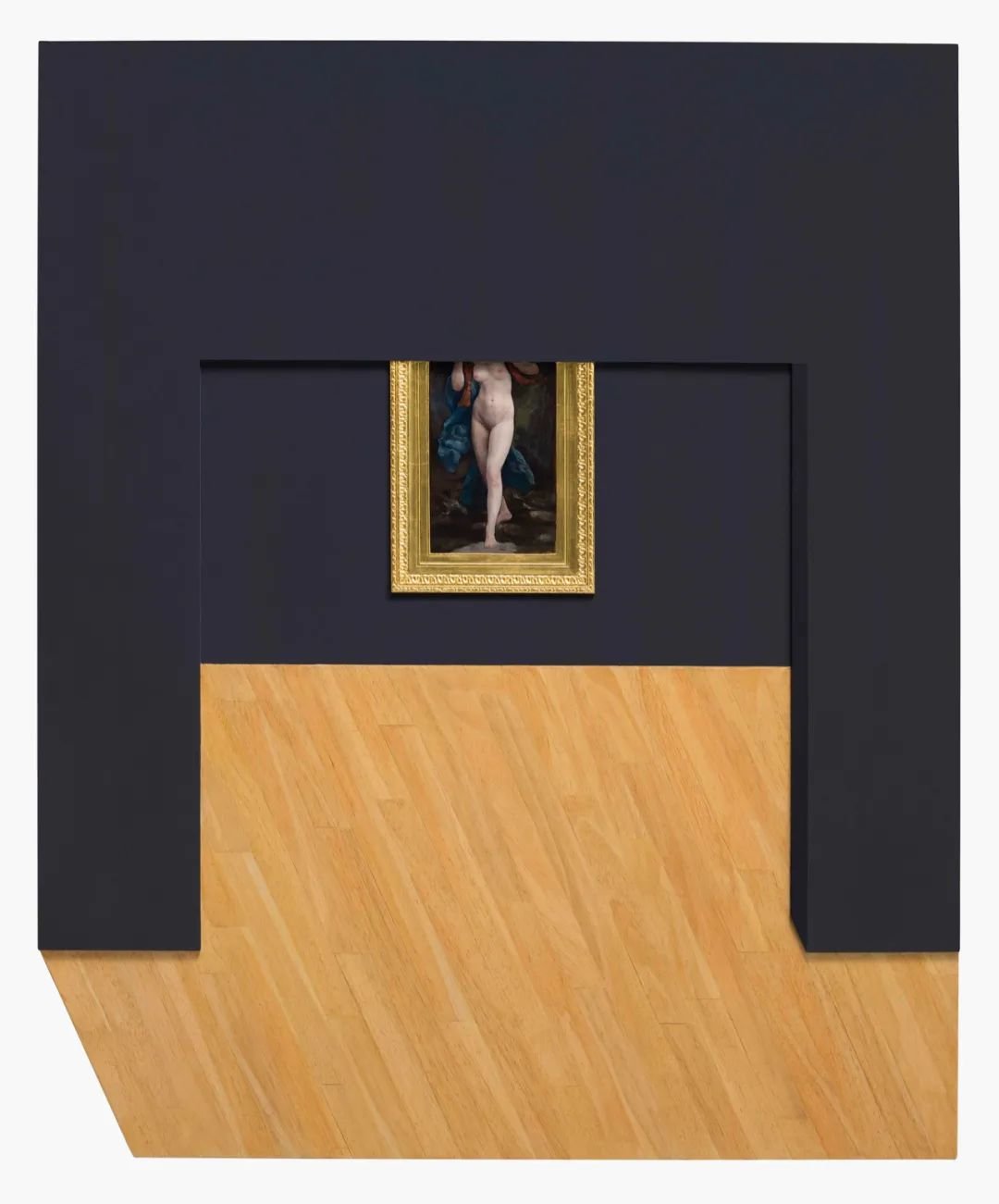 黄一山在他的博物馆系列中依然继承了其早期创作的逻辑——在网格系统中展现有破坏力的戏剧场景。同质化的艺术展示空间不断反复出现,被室内装饰隐蔽的网格系统在平行透视下依然清晰可见,这时那最有戏剧性的不就是每一张被展示的画作和雕塑吗?这正如170多年前波德莱尔所言,艺术家的神话是建立在被工业化抹平的日常生活之上。我们不难在黄一山克制的形式中感受到某种隐隐地骚动。当日常生活在今天不断被细化为更小的网格,越来越呈现为平庸和无聊,那么艺术就成为了那唯一绚丽的烟火。如果我们仔细端详其画中之画,我们不难发现,被黄一山改编过的“名作”就是那曾经荒诞不经的戏剧。