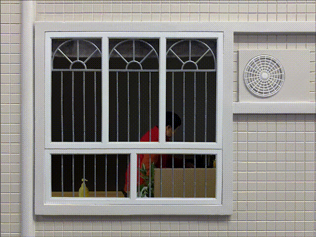 作为广州三年展的策展人,我在和黄一山讨论方案时,他强烈地希望扩展绘画的范围,回到原初文艺复习壁画对于幻觉的展示,让它在新媒介中动起来。在两件《楼宇》的作品中,代替常规的静止绘画,视频影像被内嵌于格子楼的窗格之下。在反复循环播放中室内人们的活动,如切菜做饭、运动、洗澡、抽烟……被克制的展现,这些场景如此平凡,以致于有一种荷兰17世纪画家维米尔作品的氛围感。如果我们回溯黄一山早期的绘画,维米尔《倒牛奶的女人》曾被他在创作于2008年的画作《倒鲜血的男人》中引用过。与15年前戏剧化、夸张的演绎不同,今天更成熟和克制的艺术家已经不再沉迷于表象上的戏仿,而是旨在通过视频媒介在精神气质上把握维米尔的永恒瞬间。