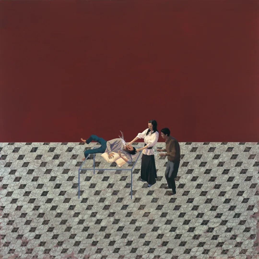 黄一山这一时期的风格让我想到文艺复兴早期艺术家皮耶罗·德拉·弗朗西斯卡的一幅绘画作品——完成于1453年的《基督的鞭打》。其清晰的透视网格结构与对主题的诡异处理形成鲜明对比,其中被鞭打的基督没有被放在突出的中心位置,而是被降级为背景,安置在立方体建筑空间之内。相反,三位身份不明的男性人物主导着前景,他们似乎对后面发生的鞭打惨剧充耳不闻。在焦点透视的空间中,在紧密的网格系统下演绎着一场残酷、冷漠的神秘主义剧目。