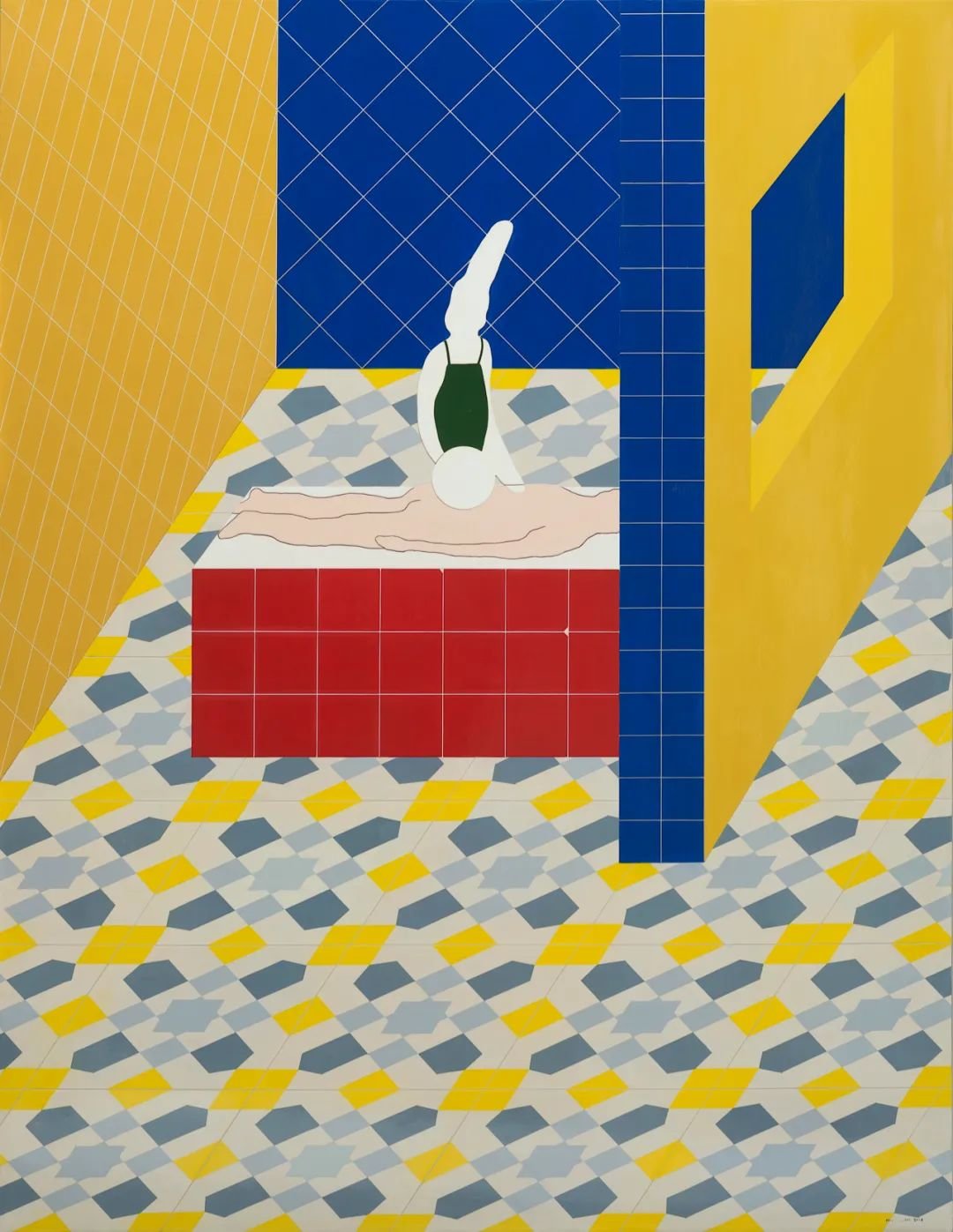 这时黄一山的作品开始出现微浮雕的倾向,一格格瓷砖被更拟物式地制作。它们在手法上很明显也受到了美国波普艺术家汤姆·韦塞尔曼作品《浴缸3》的影响。其区别在于⻩⼀⼭减弱了《浴缸3》原图像的波普感,在⾃⼰的作品中强化了极简主义⻛格(与波普艺术同期),使得⼯业空间对于⼈性的规训和异化跃然画⾯,从⽽使得霍珀般的情绪得以合理。
