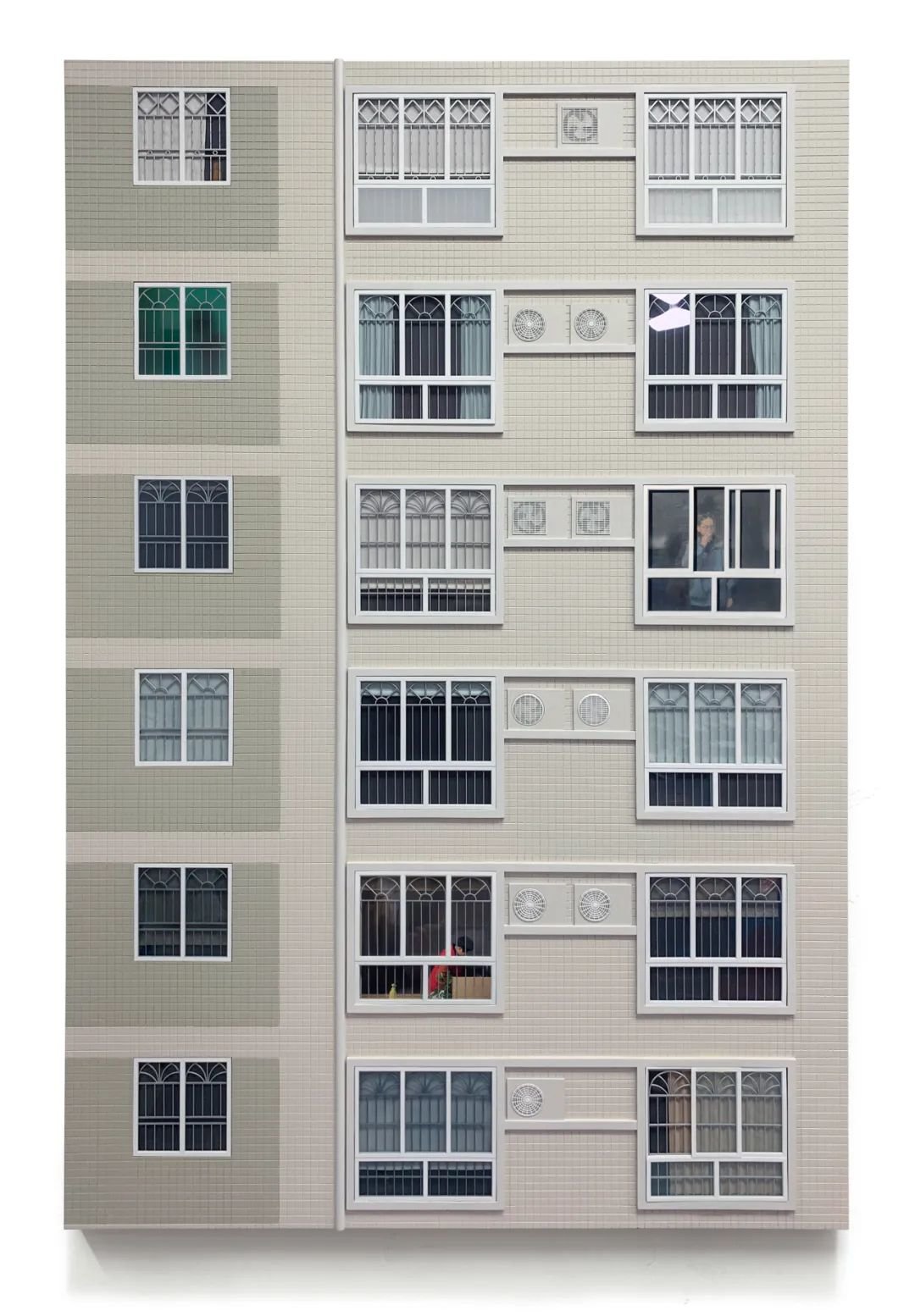 在刚刚结束的“第七届广州三年展”的“内生”板块中,黄一山展现了两件创作于2022年最新的绘画影像装置《楼宇-1》和《楼宇-2》,它们分别表现了两幢在中国最常见的格子楼。它们的外立面就是观众凝视的平面,墙壁呈现为一如既往的网格方砖,一排排的格子窗户上有着金属的防护栏,透过层层网格我们似乎可以窥视到一个个私人日常生活的场景。