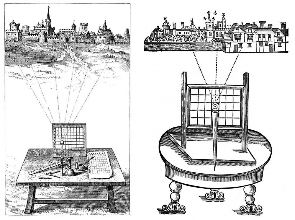 “方法如下:由细线稀疏织成的纱帘......再用粗线随意分割成许多相同的方块,并绷在框架上。我将这块纱帘置于眼睛与待表现物体之间,这样视觉锥就能穿过稀疏的纱帘。……纱帘的这种网格有很多优点,首先,因为它总是呈现相同的表面不变,因为一旦你确定了轮廓的位置,你可以立即找到你视觉锥开始的顶点,如果没有交叉点,这是极其困难的。”