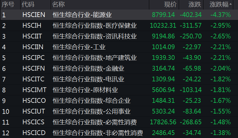 今日(5月31日),港股两大指数早盘走低,截至午间收盘,恒指跌2.25%,恒生科技指数跌2.47%。12个恒生综合行业指数悉数下跌,能源业跌幅最为明显。