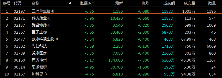 成分股多数下跌,截至午盘,三叶草生物-B跌超6%,科济药业-B、腾盛博药-B、巨子生物、欧康维视生物-B、先健科技、爱康医疗、百济神州跌超5%。