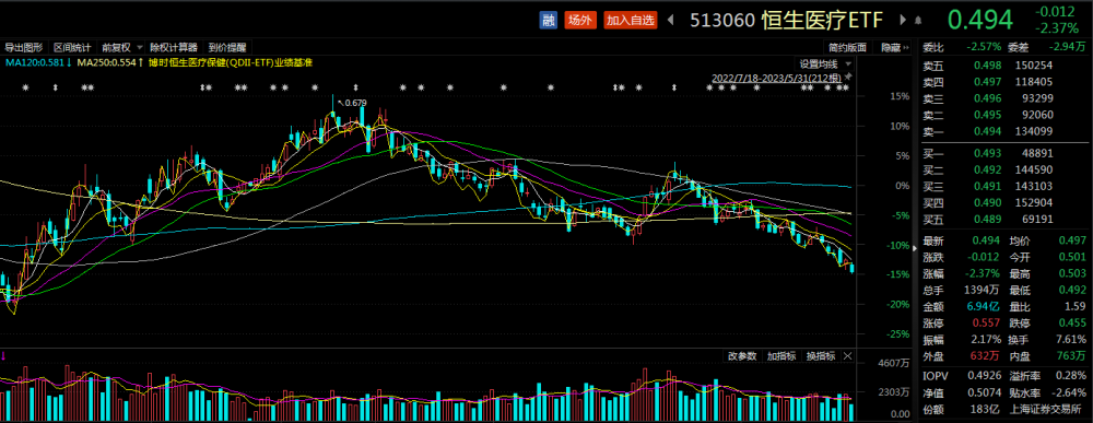 其中,恒生医疗ETF(513060)交投活跃,溢价交易。截至午盘,恒生医疗ETF(513060)跌2.37%,溢折率0.28%,换手率7.61%,成交额接近7亿元。
