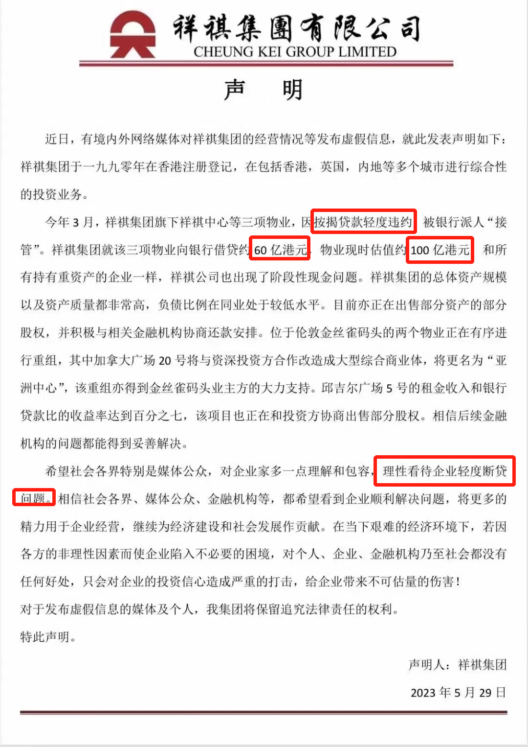 昨天下午,祥祺集团突然在官微发布声明称,因出现阶段性现金问题,今年3月,祥祺集团旗下祥祺中心等三项物业,因按揭贷款轻度违约,被银行派人“接管”。