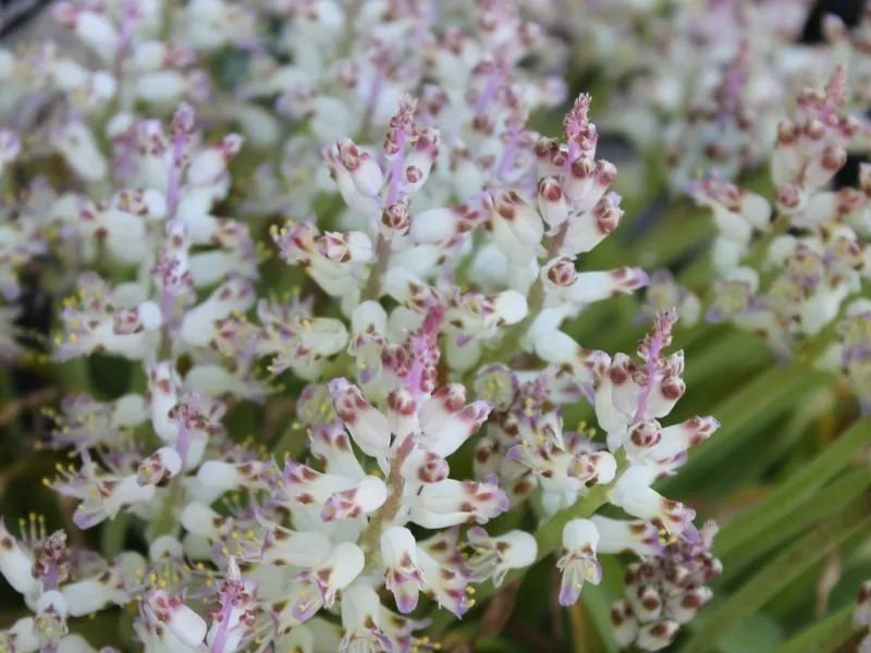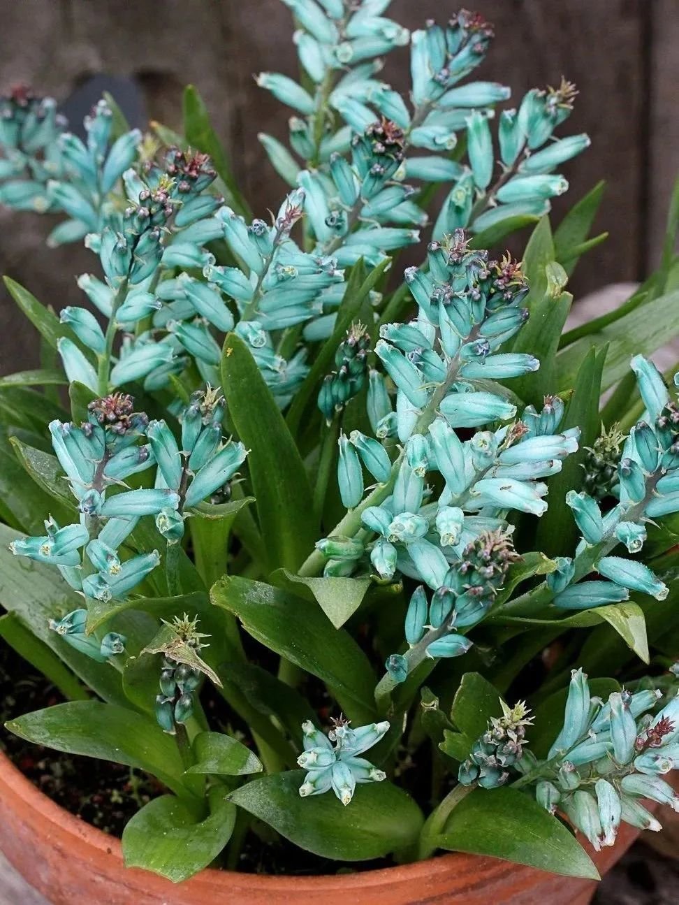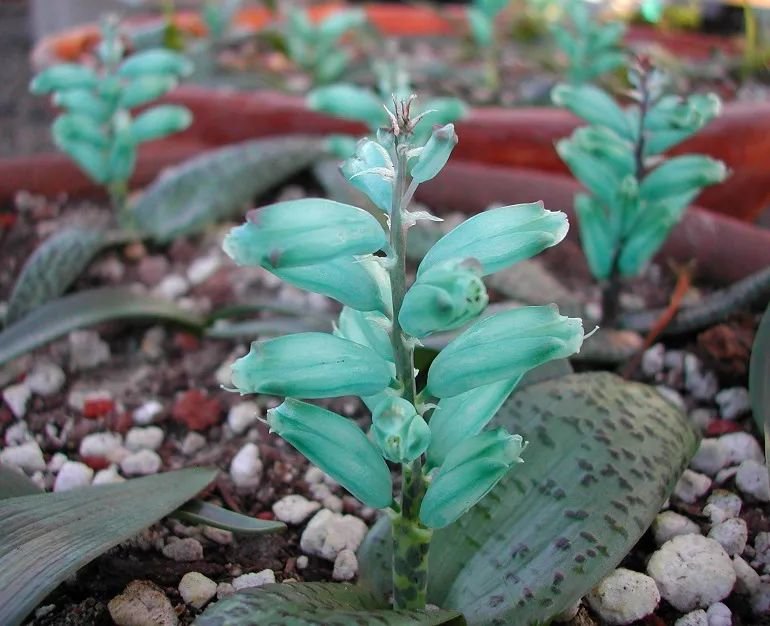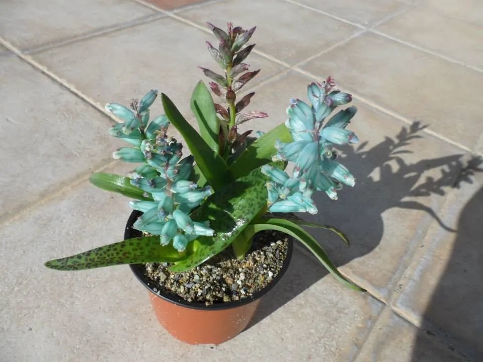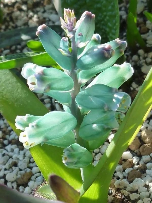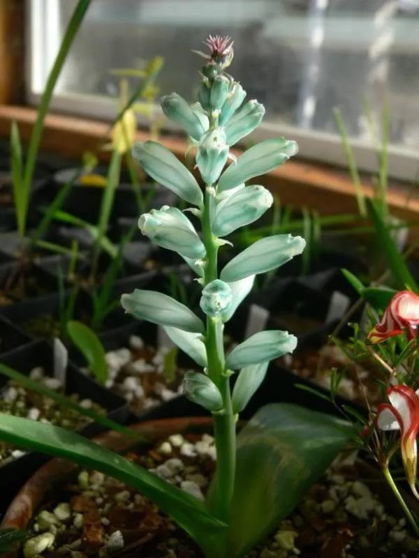 绿松石立金花在台湾地区还被称为“爆竹百合”,它的花朵和叶子观赏性都很好,是一种非常美观的球根植物,在秋冬时节就可以开出迷人的一串串花朵,小花的形态和风信子略微有一点相似,国外的花友会叫它绿松石风信子,这是一种原产于非洲南部地区的球根植物。