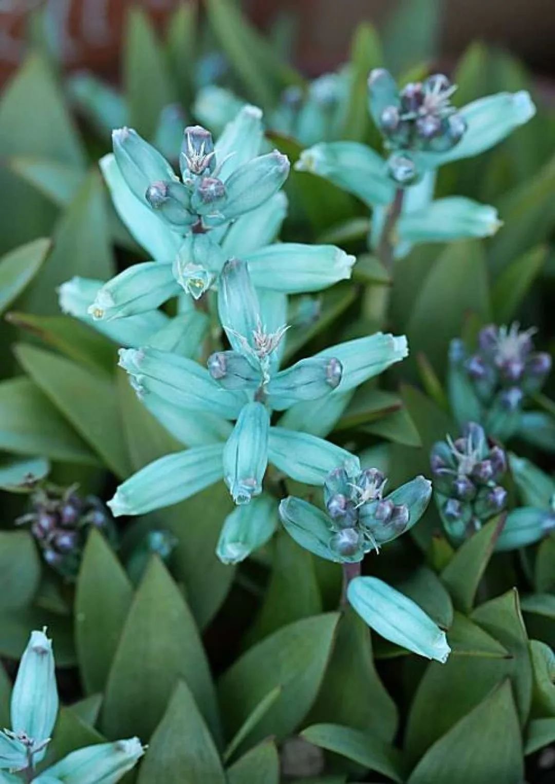 绿松石立金花的花期一般是在冬季,它能开出管状的小花,花朵里面会有很多花蜜,(在原产地)会吸引昆虫过来授粉,它的花茎比较短,且比较脆弱,观赏的时候不要随意触碰。