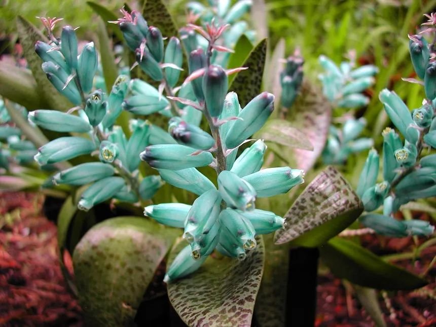 如果你比较喜欢小众的观赏花卉,那绿松石立金花就不要错过了,它的植株矮小,有着直立的茎叶,叶片是绿色的,表面上会带有很多紫褐色的斑点,而它的花序比较低矮,花序上会开出一朵朵如同绿松宝石一般的花朵,没有香味(花蜜多),花期可以维持2~3周,花后会孕育很小的黑色种子。