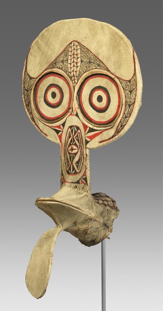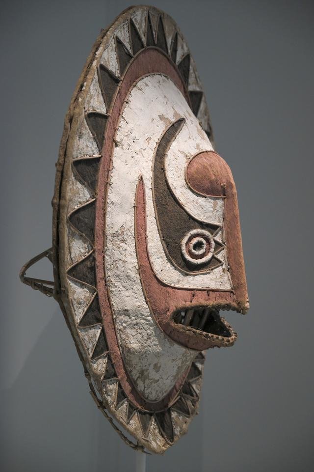 全球七大洲中,大洋洲是地球上“最小”的一个大洲,也是中国观众颇为陌生的一片地域,它大部分由分布在太平洋上的诸多岛屿组成。切莫小看大洋洲艺术,毕加索、高更、马蒂斯等一批西方现代主义艺术家都曾将其作为创作灵感的“原材料”。例如,巴布亚新几内亚拜宁族艺术家用竹子、树皮布、颜料创作的多个面具,让人不禁联想起现代主义绘画。正是佩戴着这样的面具,当地人在篝火旁彻夜激情舞动。面具框架由劈开的竹子制成,包裹了一块原色树皮布作为“皮肤”,上面绘有红色和黑色的图案。这类面具有数十种形式,每一种都描绘并献给与部族共享周围森林的某种动物或植物,自带超现实的抽象滤镜。