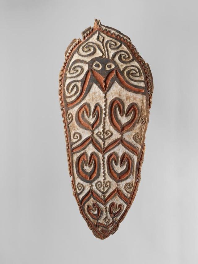 这是一批引人入胜、充满想象力的艺术品。高近两米的镂空仪式用板,19世纪曾在男性成人礼上使用,乍一看就像一块炫酷的滑板。复杂的曲线设计融合了重要的鸟类、昆虫和动物形象,其顶部中央描绘了西米甲虫的心形脸,下半部分刻有两只犀鸟相扣的图案,底部则刻有野猪的獠牙。展览中的雕塑作品,跨越了时间并兼具实用价值,它们携带了大洋洲岛屿文化从远古绵延而来的精神能量,至今都是非常活跃的,富有生命力的。比如,将一棵树的完整树干挖空后雕刻而成的高耸槽鼓、来自所罗门群岛带有戏剧性图案的仪式盾牌、镶嵌着虹彩贝壳弧形装饰线的精美独木舟船首雕塑等等。