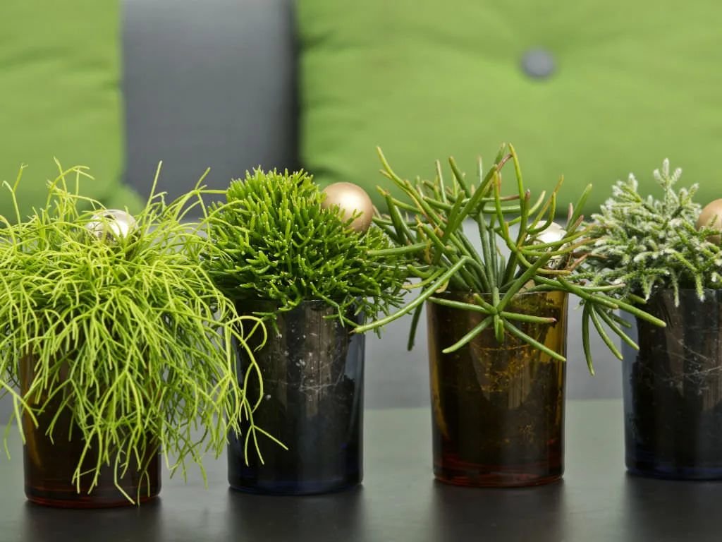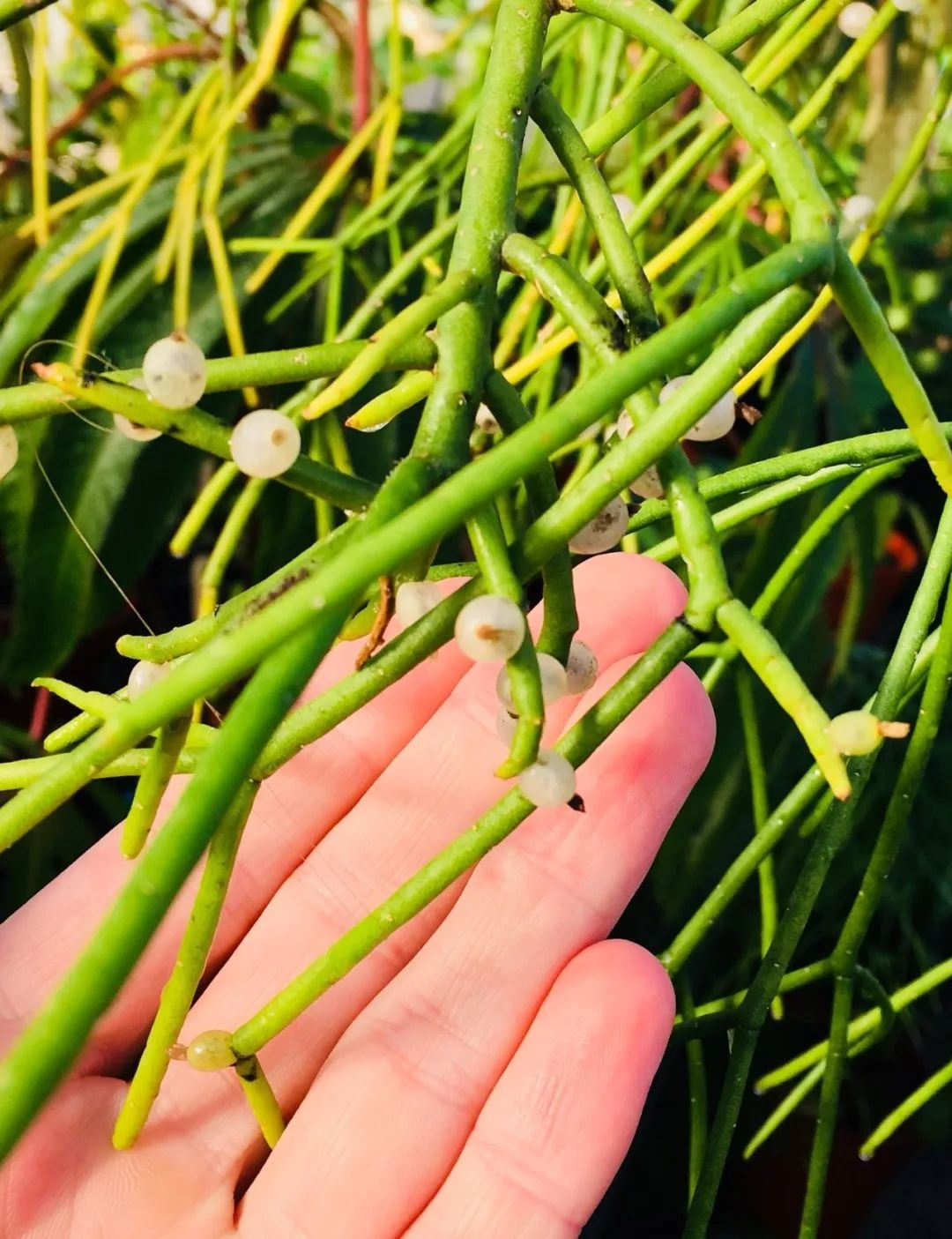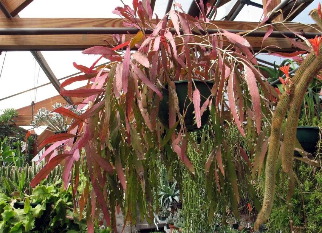 丝苇(Rhipsalis)它就是指仙人掌科丝苇属的植物,它们的品种是非常多的,茎的形态各异,有扁平像领带的,有像小棍子的,在温差大,阳光充足和低温时,绿色的茎还会变色,当然还有一些本身就是彩色茎的品种。