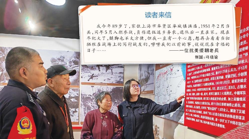 近日,本报读者服务平台收到一位抗美援朝老兵的来信,希望能在有生之年再去看望一下当年在战场上牺牲的同乡战友。但他没有留下电话和姓名,记者凭着信上简短的地址和信息,找到了奉贤公安分局洪庙派出所。