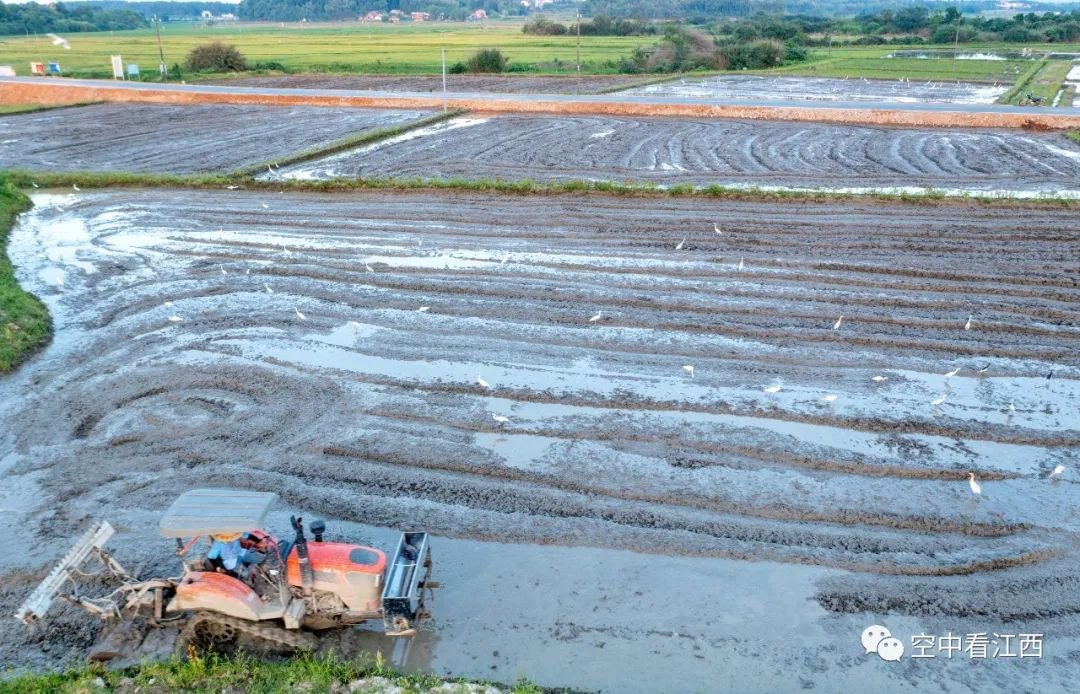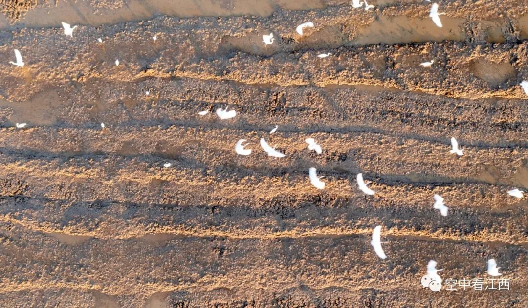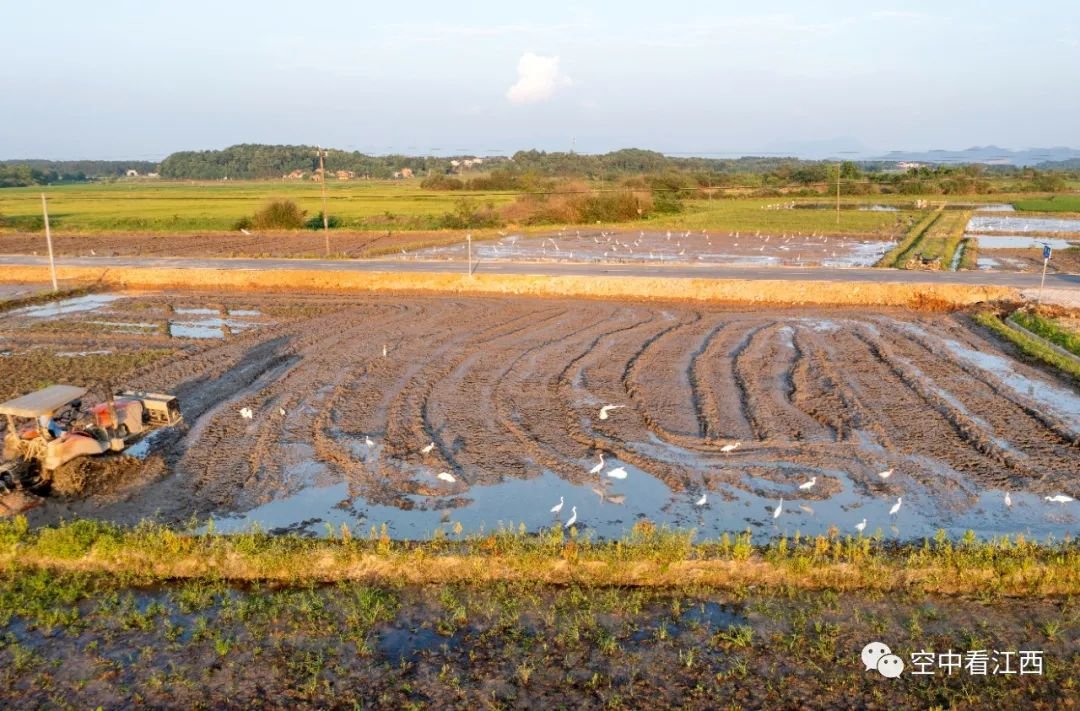 近日,航拍江西抚州金溪县双塘镇柏林村,成群的白鹭在翻耕后的农田里嬉戏觅食、“翩翩飞舞”,好一派人鸟和谐共处的生态美景。
