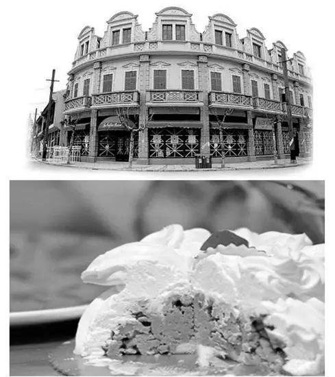 李安在电影《色戒》中专门还原了凯司令咖啡店(上图),如今在凯司令还能吃到招牌栗子蛋糕(下图)