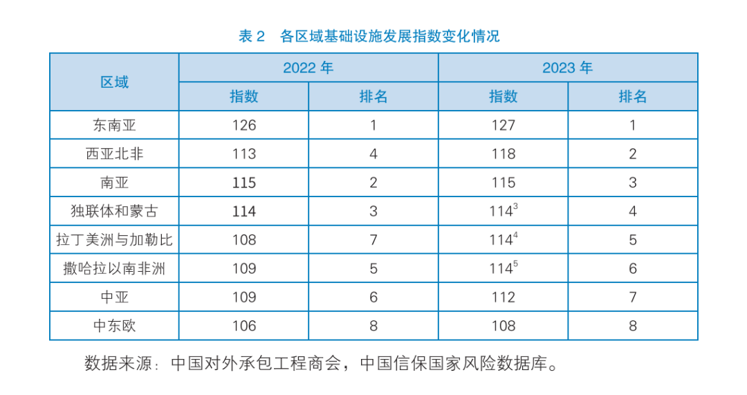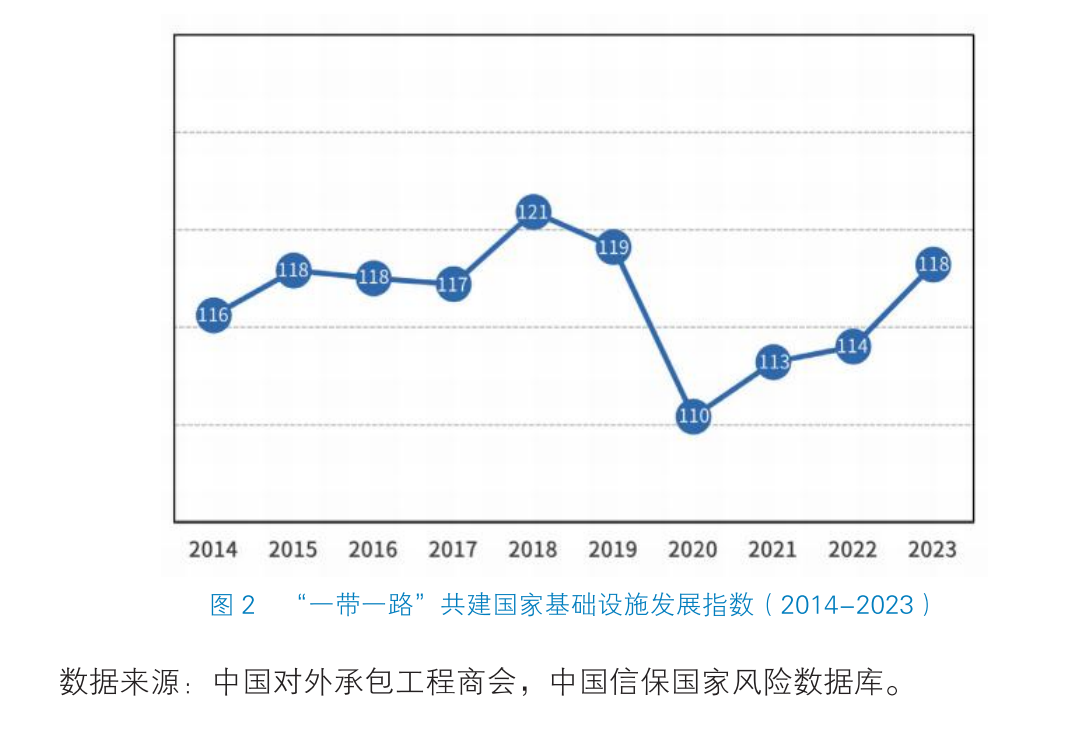随着全球经济持续复苏、新冠疫情影响大幅减弱,共建国家基建发展环境不断改善,基础设施合作态势进一步好转,总指数由2022年的114上涨至118。