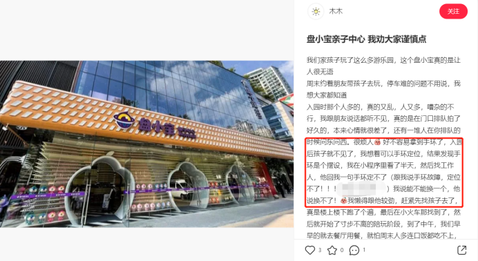 或许是过于对该功能的信任,往往让家长疏忽了对孩子的关注,小红书上有用户发布笔记称,带孩子到盘小宝游玩时,虽然孩子佩戴了手环,但在孩子不见时,却无法通过小程序定位到孩子,工作人员给出的答复是,“手环故障,定位不了。”随后该家长只能自行楼上楼下去寻找孩子。