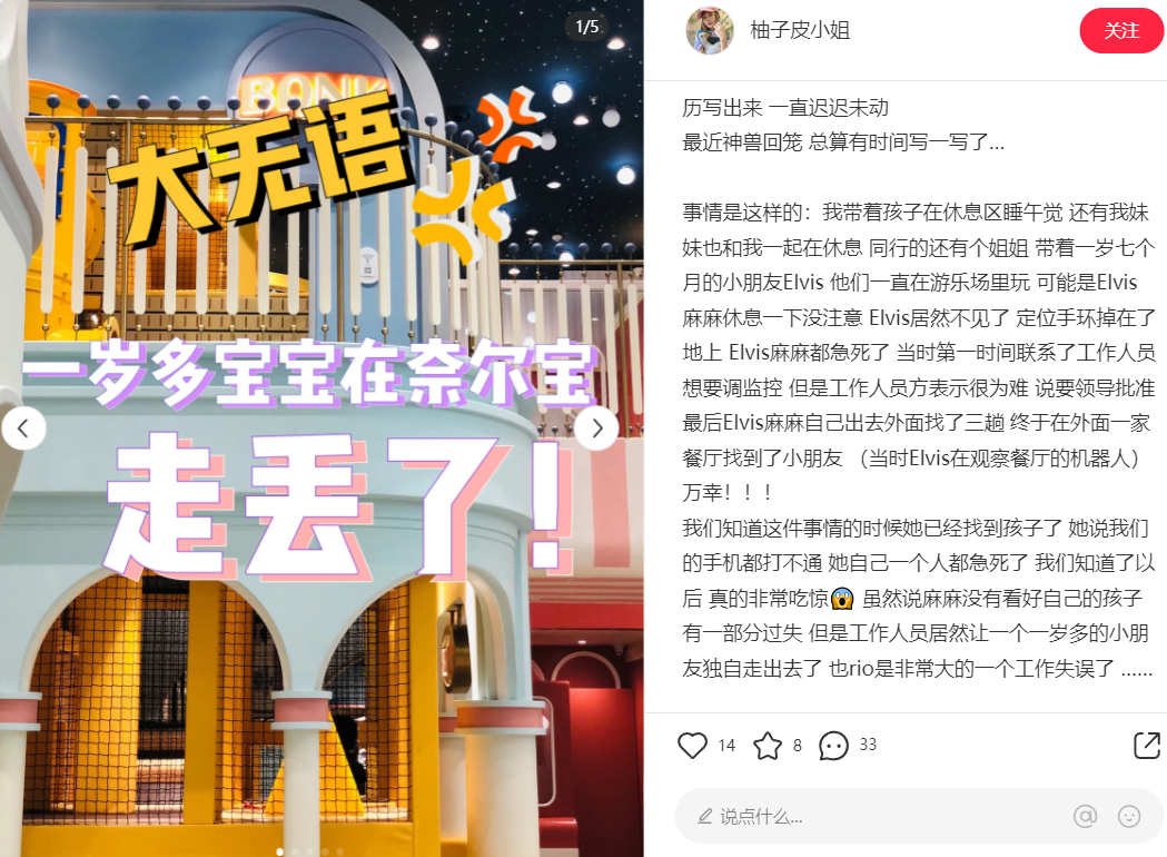 另一篇笔记中则提到,和朋友一起带孩子在奈尔宝游玩,由于家长疏忽,其中一个小朋友不见了,但定位手环掉在地上,于是家长找到工作人员想要调取监控,但工作人员却表示为难,最终还是家长自行在游乐园外面的一家餐厅中找到孩子。