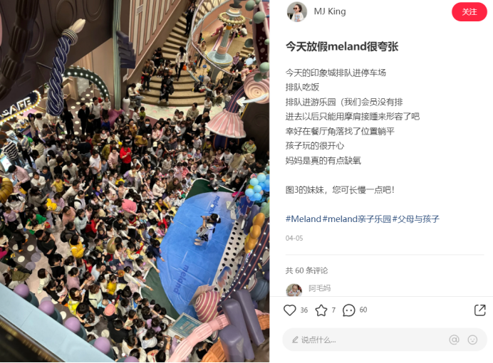 这种落差感在节假日和周末等节点尤甚。小红书上有用户分享自己周末到北京奈尔宝(爱琴海门店)体验时便提到,“所有娱乐场景全是人人人人、家长比小朋友多”,最终被“劝退”。同样的现象也出现在meland,有用户就提到,“妈妈是真的有点缺氧”。