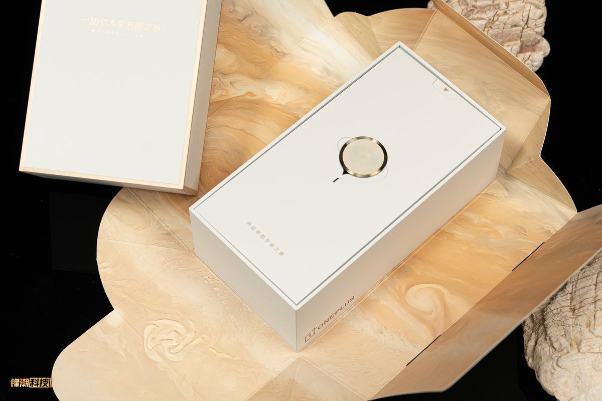 一加11 木星岩限定版包装盒外部包裹着封套,封套内部的设计参考了木星表面的颜色。打开包装盒看到的就是一个木星元素定制卡针,表面采用“木星岩”相同的材质,这就是上手的惊喜。