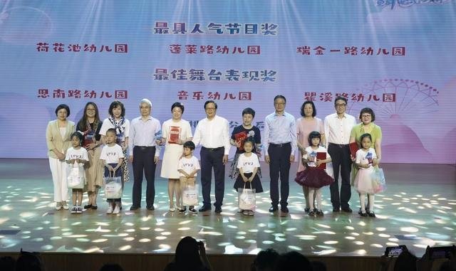 来自荷花池艺术教育集团、瑞一健康运动教育集团、“思优”个别化教育集团和蓬幼游戏化教育集团等黄浦区四大学前教育集团12所幼儿园的幼儿们进行了园歌、园舞展演。