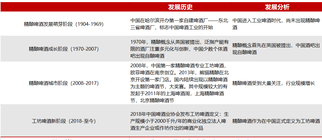 精酿啤酒随中国啤酒工业的成熟逐步步入公众视野,2008年后精酿啤酒进入成熟发展阶段,全国出现精酿啤酒屋和啤酒节等精酿啤酒文化活动,在2018年被啤酒行业相关组织定义为工坊啤酒