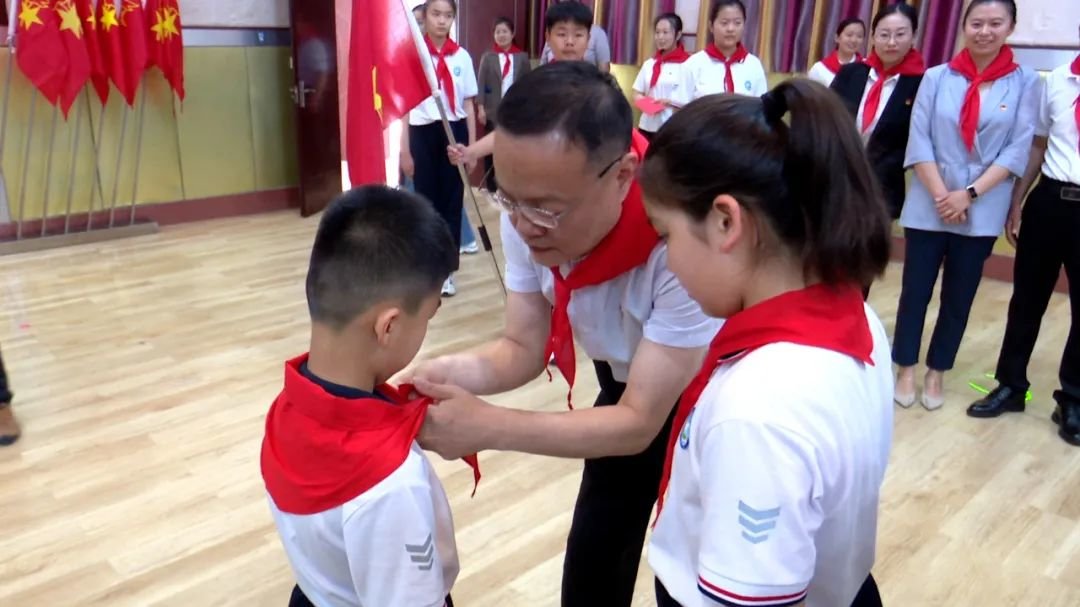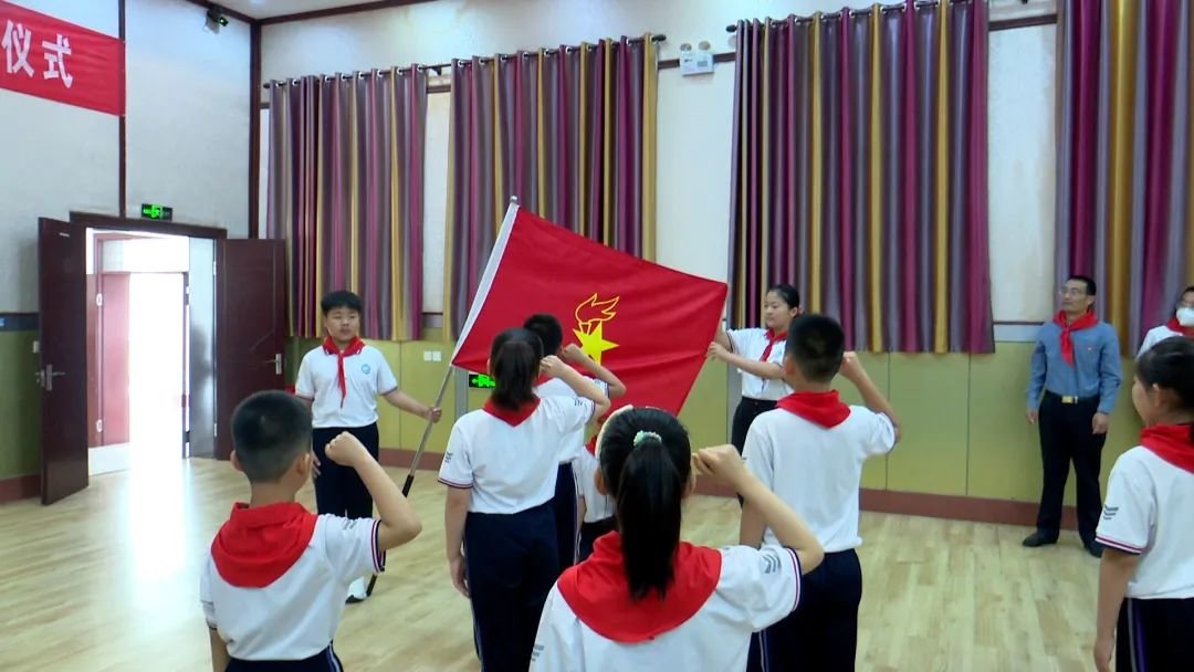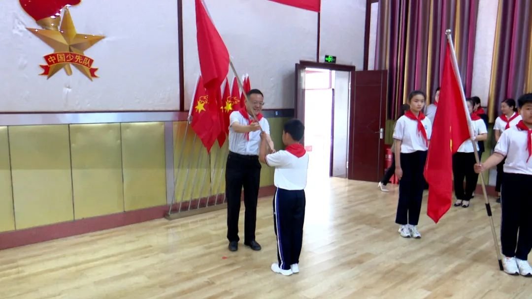 入队仪式在响亮的中国少年先锋队队歌声中拉开序幕,孙奇宏、陆山、田丹以及少先队老队员为新队员佩戴红领巾。随后孙奇宏为新建中队授中队旗,新老少先队员们面向队旗、高举右拳,立下爱党爱国爱人民的铮铮誓言。出队旗、唱队歌、授红领巾、宣誓、授旗、呼号等入队环节规范、庄重、有序。