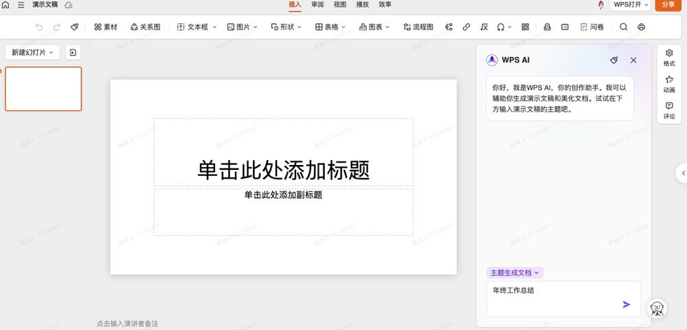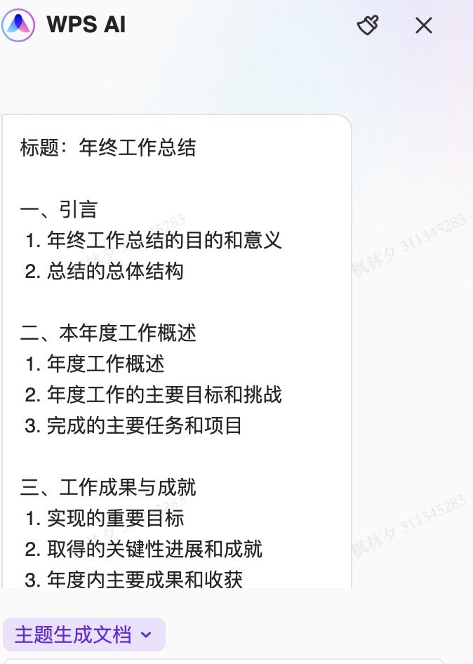 以“年终总结”为例,在输入命令后,WPS AI会在一分钟内向用户输出演示文档制作方案,如果用户满意方案可进入下一步制作环节,反之可要求其重新生成方案。