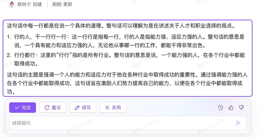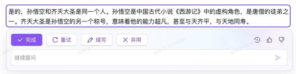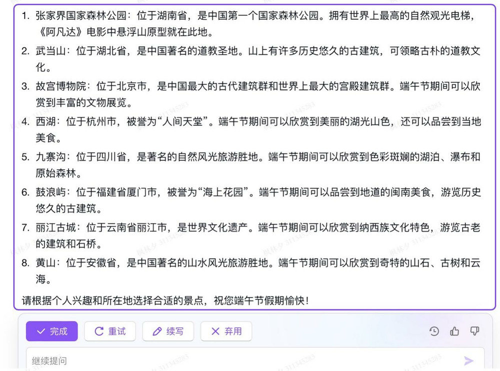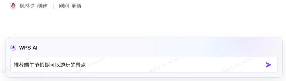 对比目前国内推出的文心一言、通义千问、讯飞星火等语言大模型,身处办公软件中的WPS AI似乎容易忽视语言交互能力。我们来问“推荐端午节假期可以游玩的景点”“孙悟空和齐天大圣是不是一个人?”“请问这句话中每一个行是什么意思,‘行的人,干一行行一行,行行都行。’”三个问题,来看看WPS AI的语言理解能力。