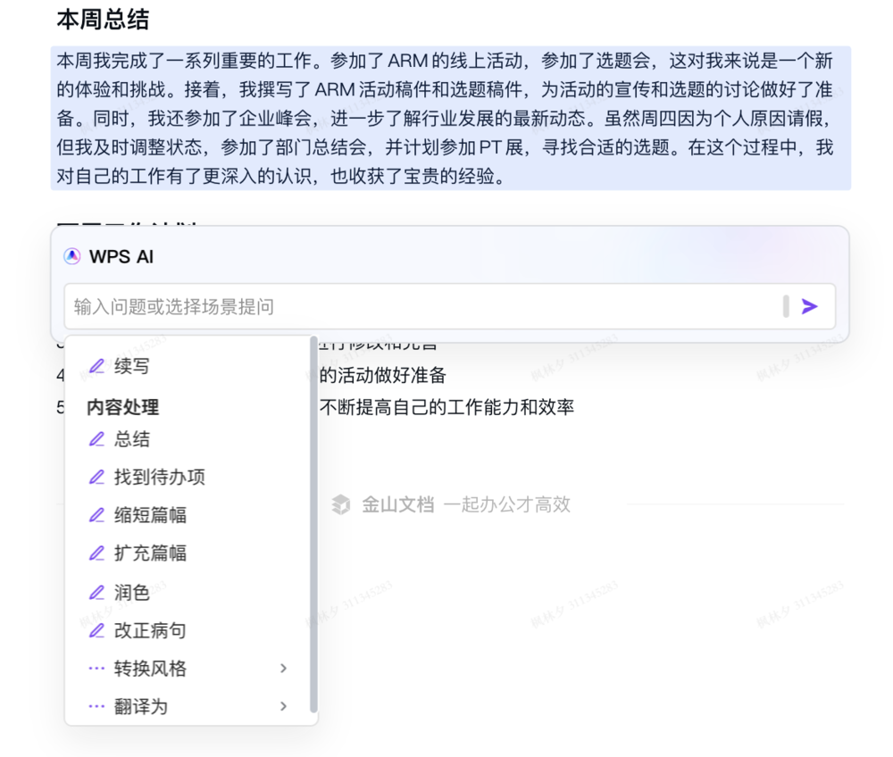 DoNews在对话框简单输入本周工作内容及下周工作计划,WPS AI随即生成了一份完整的周报,使周报内容更具亮点。