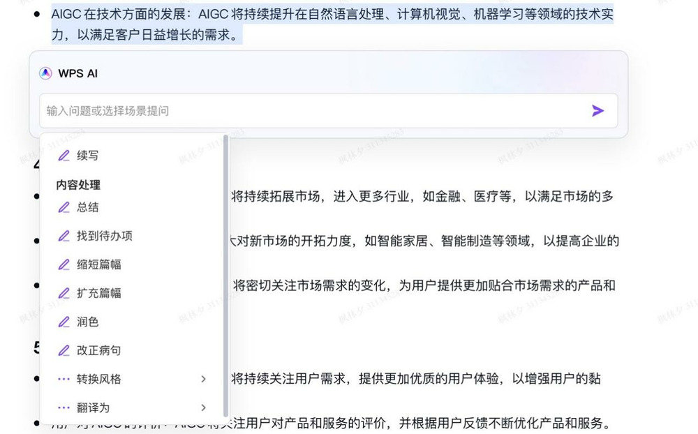 除此之外,让人眼前一亮的是,如果用户对某一部分的文本内容不满意,可选中文本后点击右键,即可召唤出功能列表,列表中的“缩短篇幅”“扩充篇幅”“润色”“改正病句”“转换风格”等功能,可作为文章再加工的解决方案。