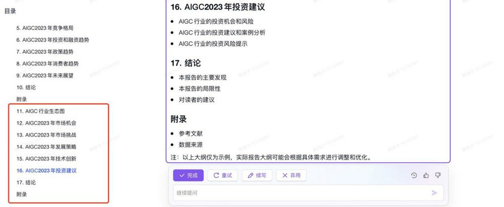 在尝试写文章大纲的过程中,DoNews发现WPS AI支持多轮对话交互,在初步输入主题时,它给出的内容是十分简短,仅到二级标题。当然如果对生成的目录不满意,还能够“重试”或“续写”。