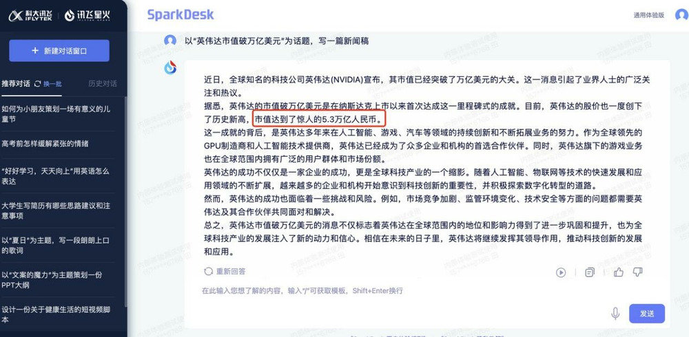这一问题并非WPS AI独有的,而是目前大模型的通病。以相同问题问讯飞星火。他给出的回复也基本是模版化的话术,同样在数据的准确性上依然表现不足。