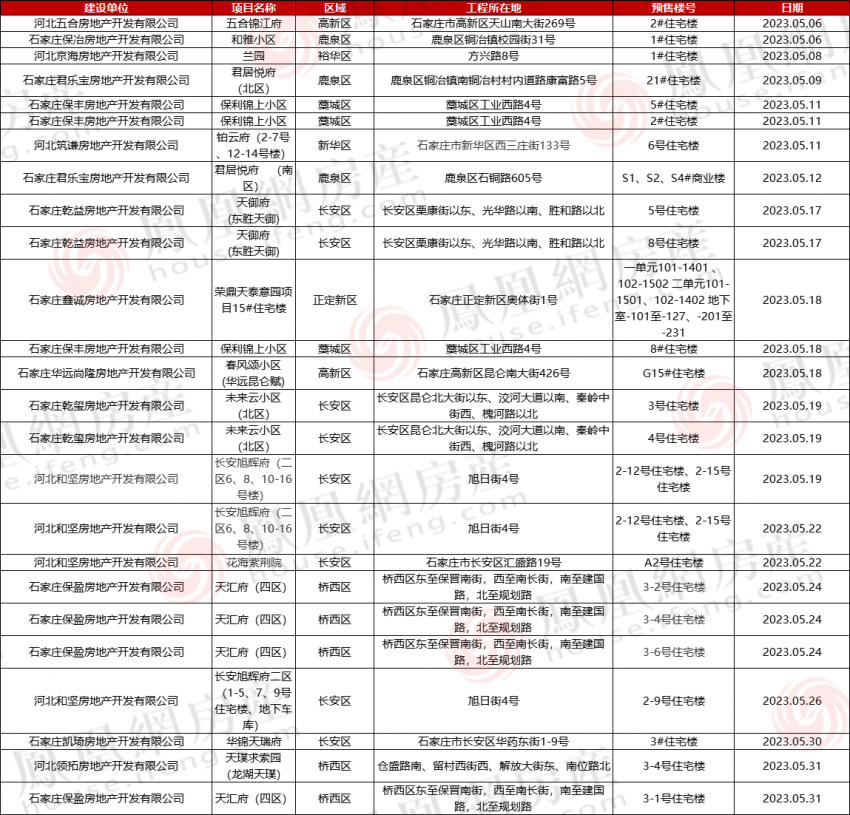 据凤凰网房产不完全统计,5月石家庄下发25张预售证 ,共涉及15个项目,获证项目详情如下: